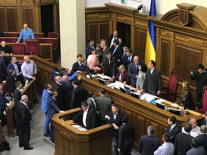 В ВРУ в ходе вечернего заседания был объявлен перерыв. Спикер Андрей Прубий пригласил лидеров политических партий на совещание после того, как во время рассмотрения законопроектов о реинтеграции Донбасса народные избранники заблокировали трибуну и устроили потасовку в зале для сессий.