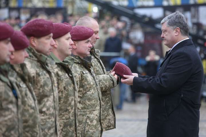 Накануне Порошенко заявил о смене цвета беретов десантников Украины с голубого на бордовый. По его словам, такой выбор не случаен, так как бордовый цвет символизирует цвет крови, которую пролили украински защитники в боях за свою страну.