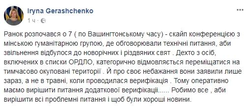 Теперь украинской стороне, которая столкнулась с неожиданным заявлением, приходится уточнять список пленных для обмена. В мае текущего года, некоторые из лиц, включенные в списки «ОРДЛО» молчали о своем желании остаться на территории, подконтрольной Киеву. Они заявили об этом только накануне долгожданного большого обмена. Об этом в Фейсбуке написала представитель Украины в гуманитарной подгруппе контактной группы Ирина Геращенко.