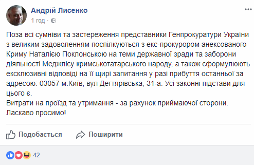 Ответ ГПУ на заявление Натальи Поклонской последовал незамедлительно. Глава пресс-службы ведомства Андрей Лысенко заявил, что ответит на все вопросы депутата Госдумы в случае ее прибытия в Киев. При этом, с удовольствием пообщается с экс-прокурором Крыма на тему запрета деятельности Меджлиса крымскотатарского народа и госизмены. Лысенко также добавил, что Украина оплатит все расходы представителя РФ на проезд и проживание.