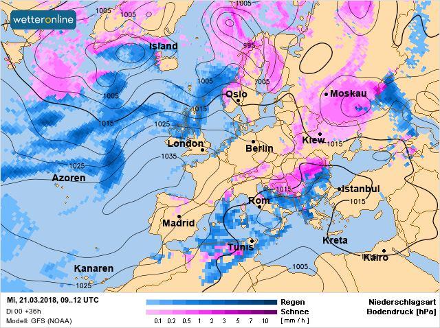 "21-го марта снег еще будет подсыпать (карта 1), особенно ночью, однако уже днем на юге будут просветления. А на Западе - только местами небольшой снег. То есть, завтра циклон ослабнет.