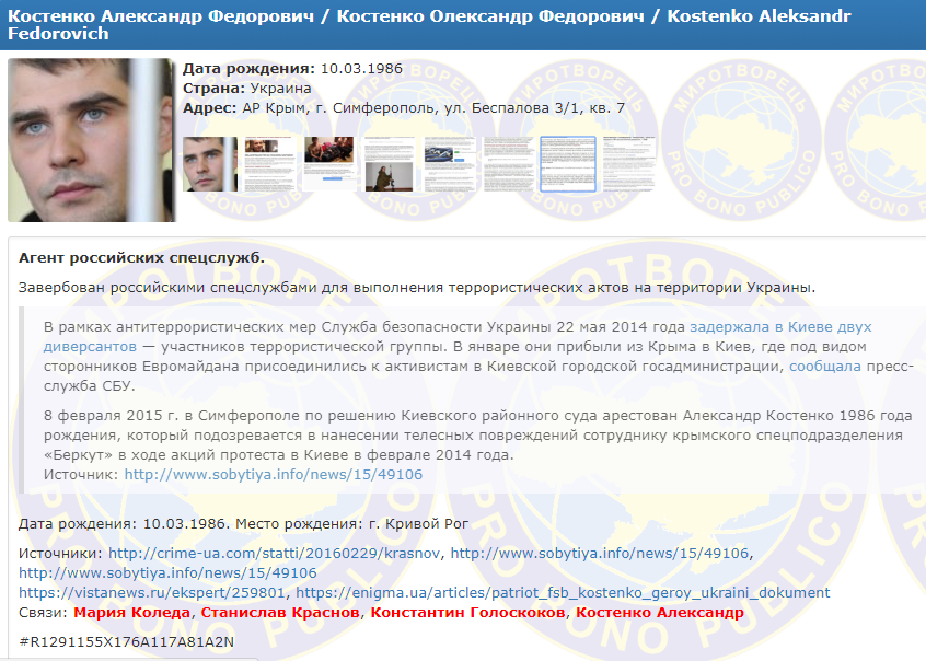 Он также добавил, что Костенко есть в базе "Миротворца", а россиский паспорт он получил в Крыму по собственному желанию до задержания.