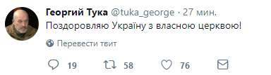 Так, замминистра по вопросам оккупированных территорий и ВПЛ Георгий Тука поздравил Украину с собственной церковью.