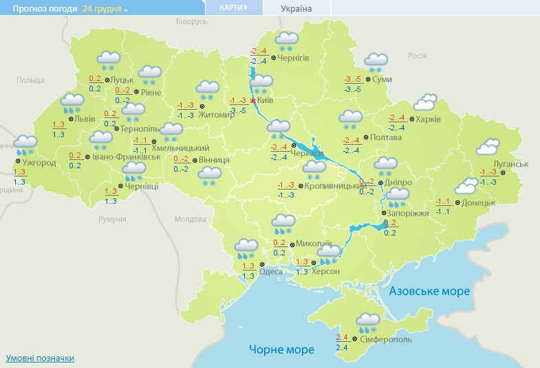 В католическое Рождество 25 декабря снижение температуры продолжится по всей Украине, главным образом ночью. Практически по всей стране будет идти снег, особенно интенсивно - в восточных областях. Лишь на Закарпатье и Буковине без осадков. В Крыму ожидается мокрый снег с дождем.