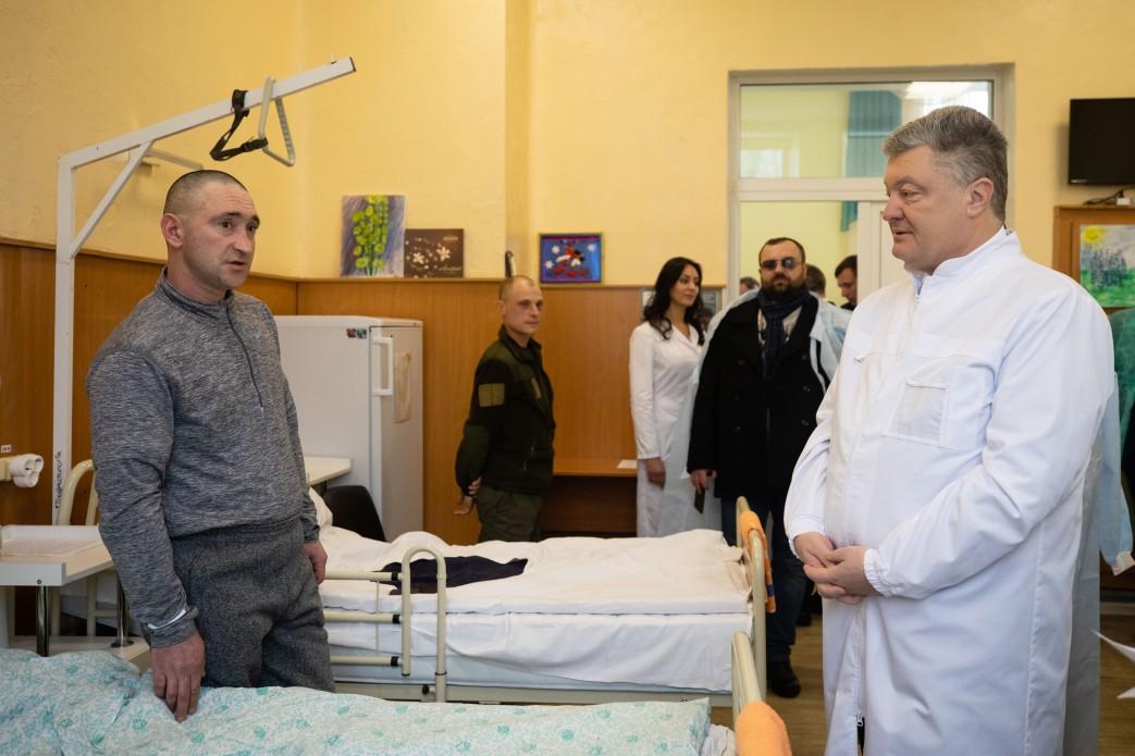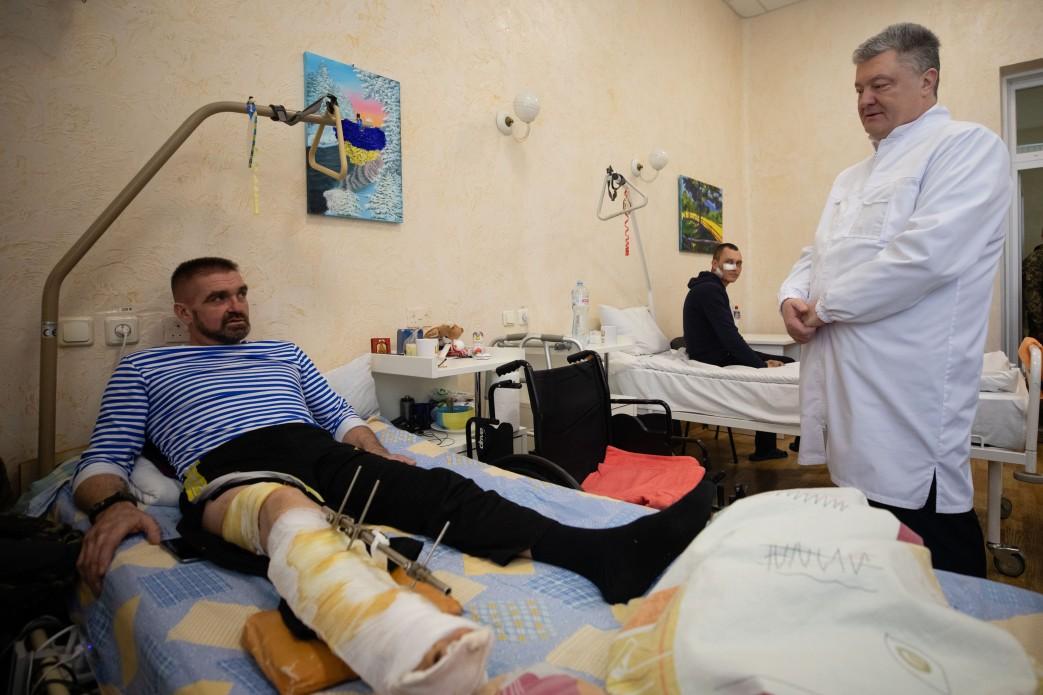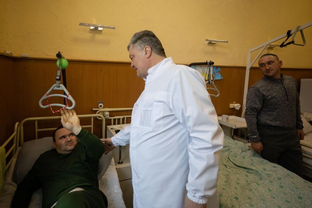 Президент, Верховный Главнокомандующий Вооруженных Сил Украины Петр Порошенко посетил военнослужащих 72 отдельной механизированной бригады им. Черных Запорожцев, которые находятся на лечении в Национальном военно-медицинском клиническом центре «Главный военный клинический госпиталь».
