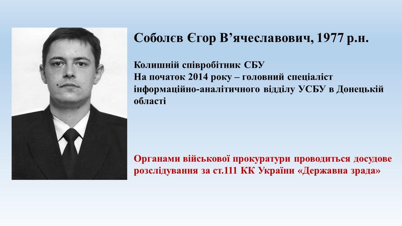 Автором этого циничного плана является гражданин Украины, к сожалению, бывший сотрудник Службы безопасности Украины, а ныне начальник одного из отделов «МГБ ДНР» Соболев Егор Вячеславович. «Мы сознательно публикуем эту фамилию для того, чтобы предатель понимал, что вскоре он будет отвечать перед законом не только за измену присяге, но и за организацию указанных выше преступлений», - отметил Василий Грицак.