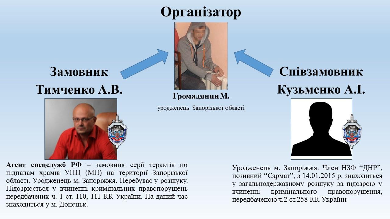 СБУ установлено и задокументировано причастность этих лиц к организации еще двух поджогов культовых сооружений УПЦ МП в Запорожье 6 и 11 февраля этого года.