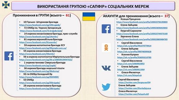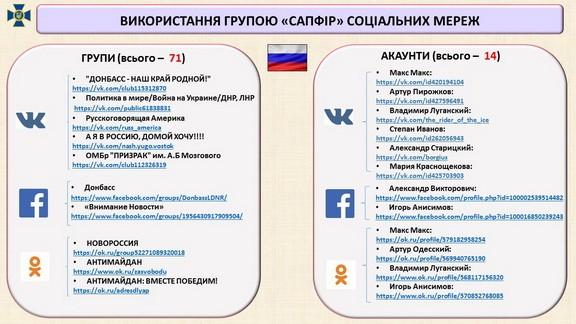 Правоохранители установили аккаунты в социальных сетях, которые группа «Сапфир» использовала для проникновения в Интернет-сообщества подразделений Вооруженных Сил Украины, где систематически распространяла выгодные российской стороне фейковые материалы, дискредитирующие украинскую государственность. Сейчас совместно с Департаментом контрразведывательной защиты интересов государства в сфере информационной безопасности СБУ реализуется комплекс мероприятий для блокировки этих ресурсов.