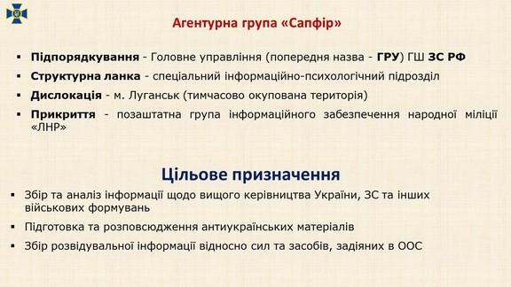 Правоохранители задокументировали, что в состав подразделения «Сапфир» входит пятнадцать идентифицированных членов незаконного вооруженного формирования так называемой «народной милиции «ЛНР». Возглавляет группу завербованная военной разведкой России гражданка Украины - Василина Екатерина Геннадьевна.