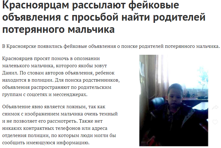 На просторах интернета уже несколько дней "гуляют" фейковые сообщения о якобы найденном ребенке. Цель распространения этой ложной информации непонятна.