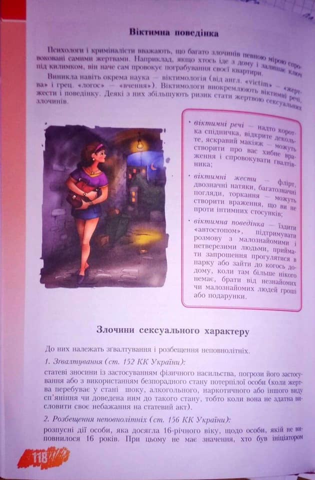 На представеленных страницах учебного пособия рассказывается о виктимном поведении и виктимных вещах, которые могут спровоцировать сексуальное насилие. Так, указывается, что короткая юбка, декольте, макияж, флирт, многозначительные взгляды и т.д. могут создать ложное впечатление, что человек не против вступить в интимные отношения. По той же причине авторы учебника предостерегают от путешествий автостопом, разговоров с малознакомыми и нетрезвыми людьми, походов к кому-либо домой, когда там больше никого нет и т.п.