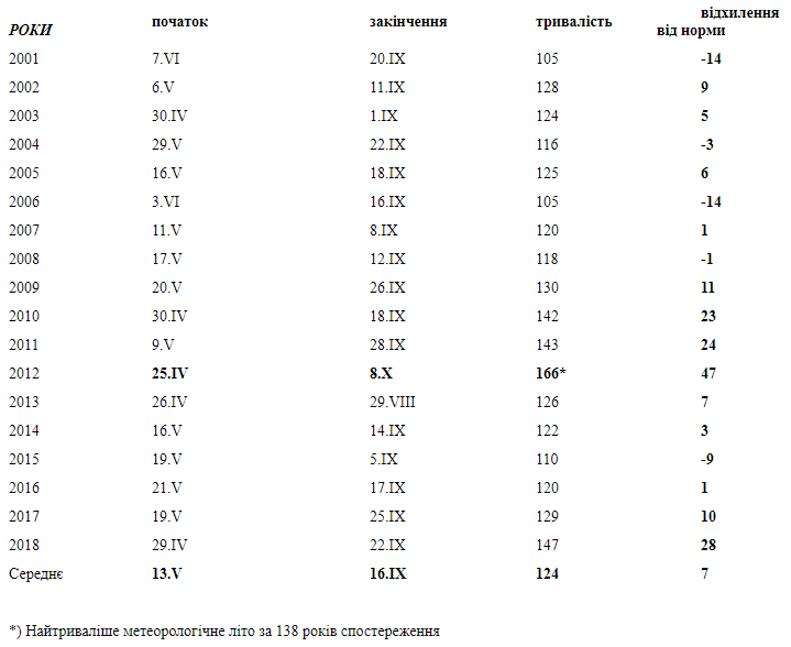 Геофизики также обнародовали наглядную информацию о начале и конце метеорологического лета в Киеве за последние 18 лет. Отмечается, что в 2012 году было самое долгое метеорологическое лето за 138 лет наблюдений: оно длилось 166 дней.