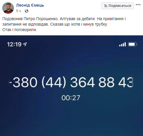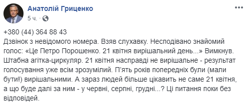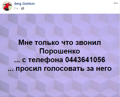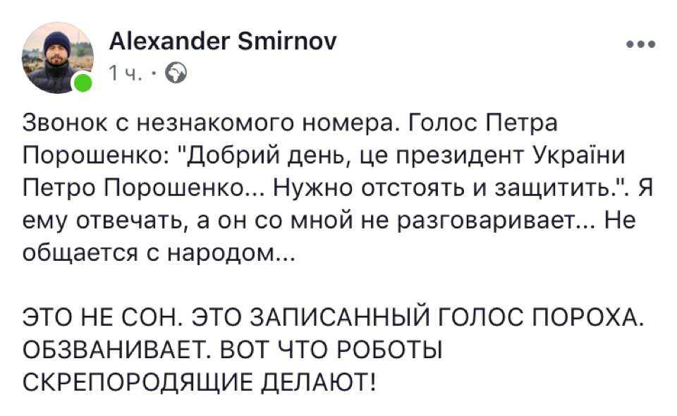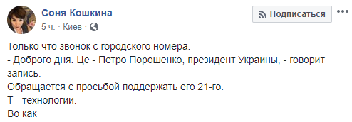 "Добрый день! Это Петр Порошенко, президент Украины. 21 апреля - решающий день, который определит судьбу Украины. Прошу вас поддержать мой курс, демократию и достоинство, а не реванш; стабильную гривню, а не инфляцию; путь в Европейский Союз и НАТО. Поддержите сильную Украину, а не страну, которая упадет на колени. Главное - сохранить страну и до встречи 21-го", - такой текст слышат украинцы, когда отвечают на звонок.