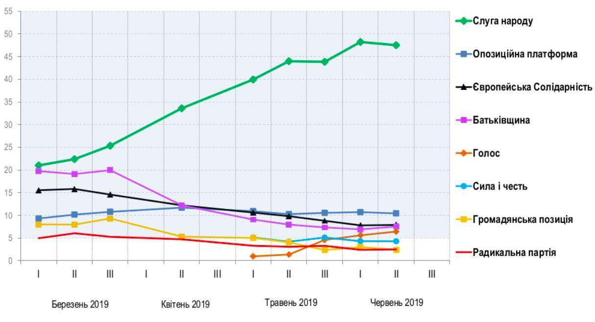 В течение 6-9 июня 2019, 69% украинцев выразили однозначную готовность принять участие в голосовании на досрочных выборах в Верховную Раду 21 июля 2019 года. Еще 15% отметили, что скорее готовы участвовать, 12% - не будут голосовать, 4% - не определились.
