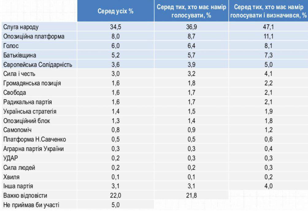 А это свидетельствует о том, что если бы выборы состоялись в ближайшее воскресенье, то "Европейская Солидарность" оказалась бы у самого избирательного барьера, так как "Голос" ее значительно опередил, обойдя и "Батьківщину".