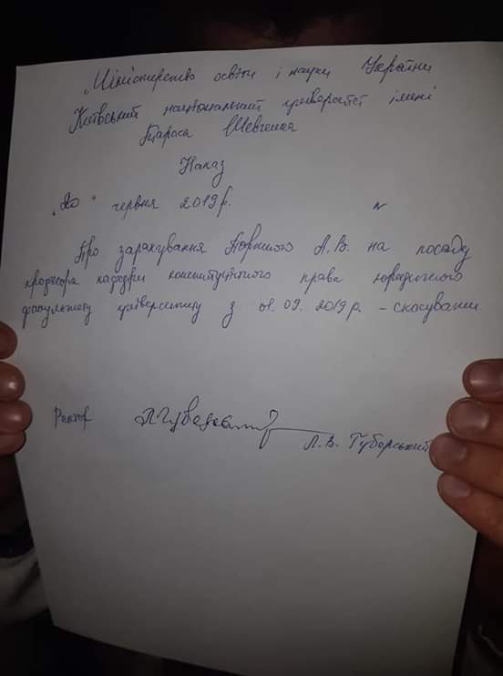 "Администрация Национального университета им. Шевченко отменила приказ о моем назначении в университет. Спокойно принимаю это решение и продолжаю заниматься Порошенко".