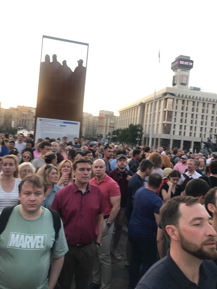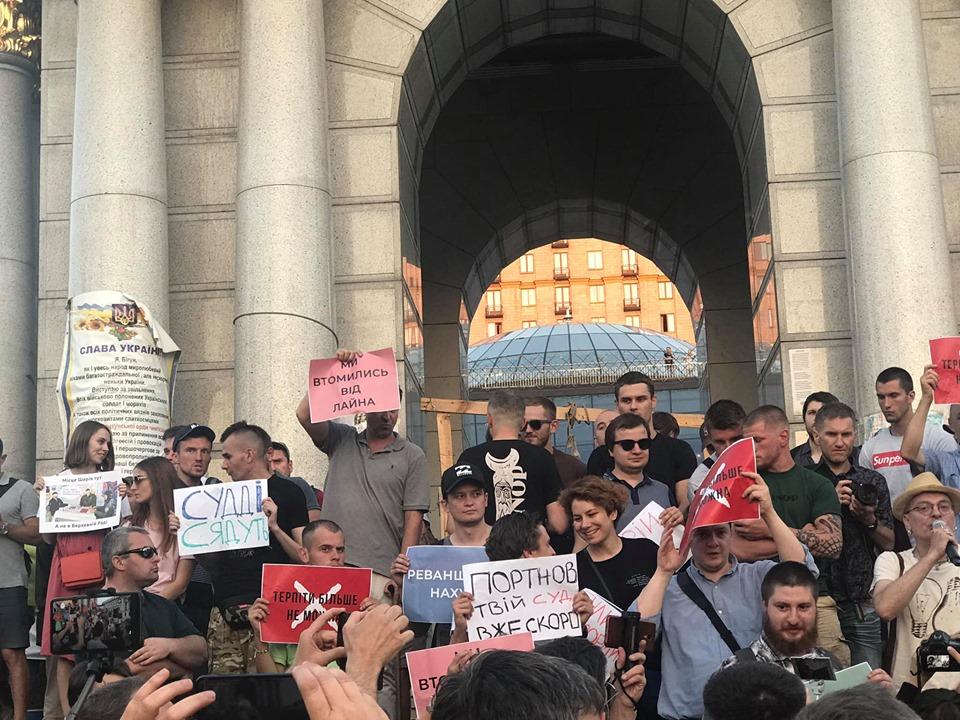 Под Стелой собрались несколько сотен человек. Они держат в руках плакаты "Терпеть больше нельзя", "Мы устали от дерьма", "Реваншуйте нах**", "Судьи сядут" и т.п.