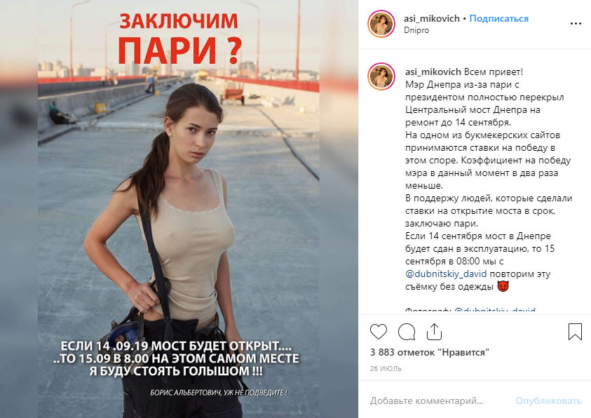 "Если 14 сентября мост в Днепре будет сдан в эксплуатацию, то 15 сентября в 08:00 мы повторим эту съёмку без одежды".