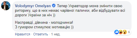 К слову, ранее в комментарии к посту Игоря Шевченко Омелян похвалил креативный метод Минюковой стимулировать ремонт мостов и дорог.