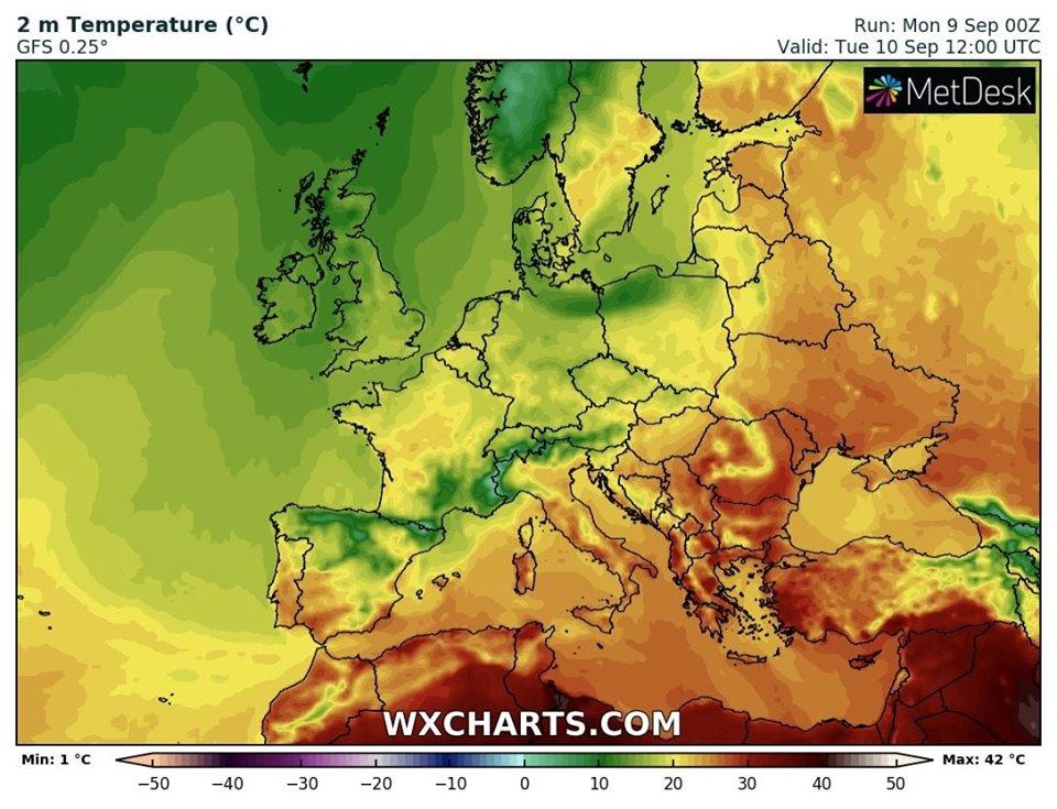 "10-го сентября огромная масштабная полоса высокого атмосферного давления, что вытянулась от Атлантики через всю континентальную Европу до Украины, приведет сухую малооблачную солнечную погоду.