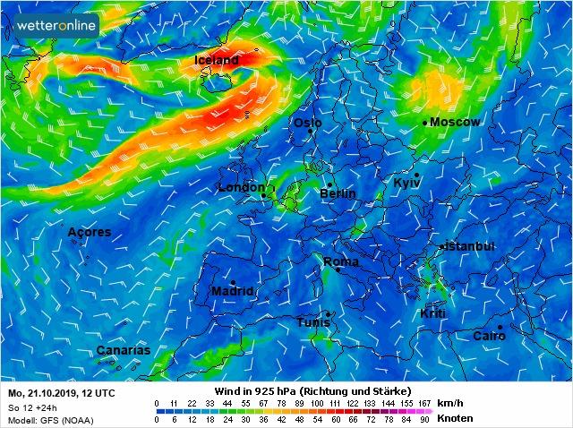 На карте 3, прогностической карте направления и скорости ветра на 21 октября, заметно, что ситуация особо не изменится.
