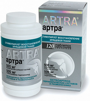 Справка. Артра - комбинированный хондропротекторный препарат, в состав которого входят действующие вещества хондроитин сульфат натрия и глюкозамина гидрохлорид. Применяется при заболеваниях опорно-двигательного аппарата, в частности при остеоартрозе позвоночника и периферических суставов. Лекарство способствует восстановлению хрящевой ткани, улучшает подвижность суставов, снижает боль.
