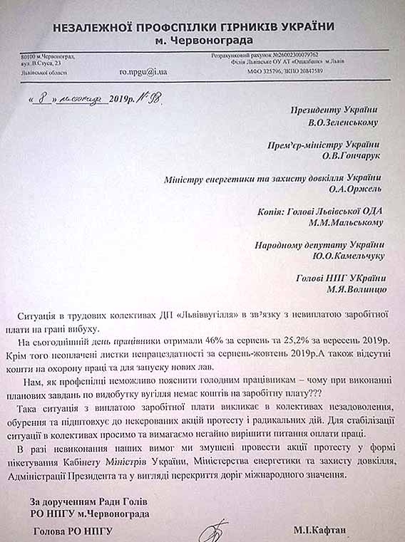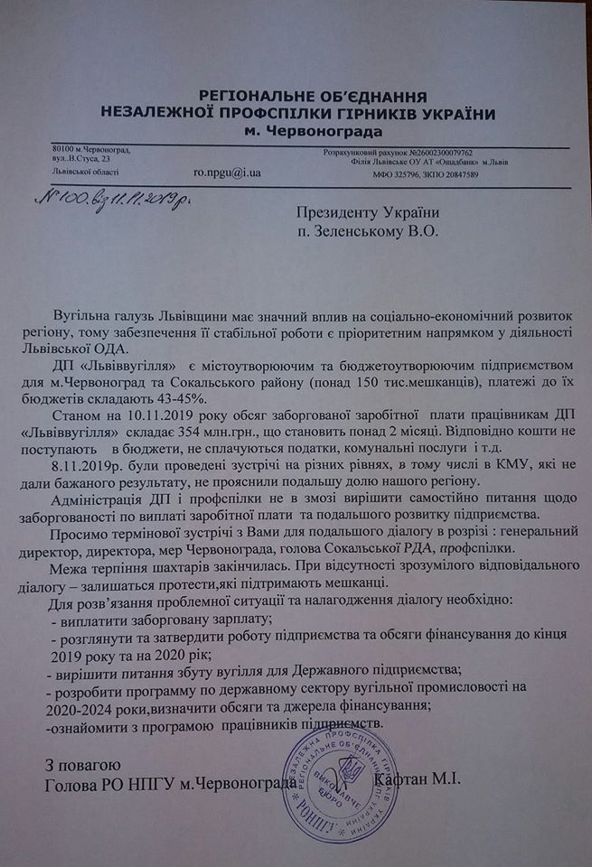 Горняки Червонограда пишут обращения к президенту Владимиру Зеленскому с просьбой повлиять на ситуацию, в противном случае - обещают протесты и перекрытие дорог международного значения.