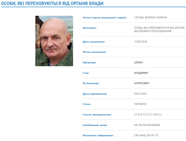 Цемах внесен в список лиц, которые скрываются от органов власти. Дата его исчезновения указана 23.09.2019 года.