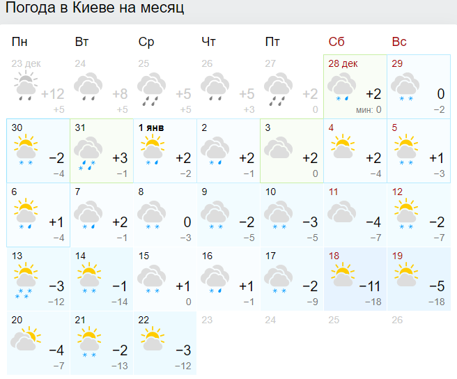 В Киеве в начале января температура будет колебаться около нуля, а после 9-го числа верх возьмут морозы. После короткого потепления, с 18 января возможны ночные температуры до -18 градусов.