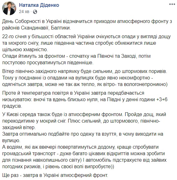 "Циклон зайдет в Украину в среду, 22 января. Начнется непогода с Севера и Запада и дальше продвинется в сторону Юга. Тем не менее, южные области в среду ограничатся лишь плотной облачностью", - написала Диденко.