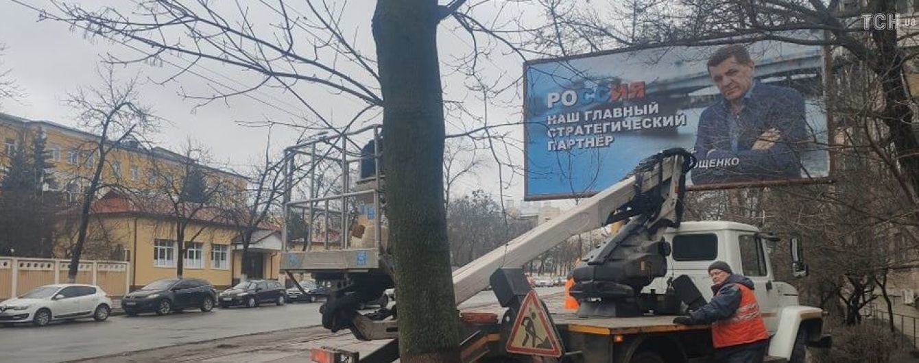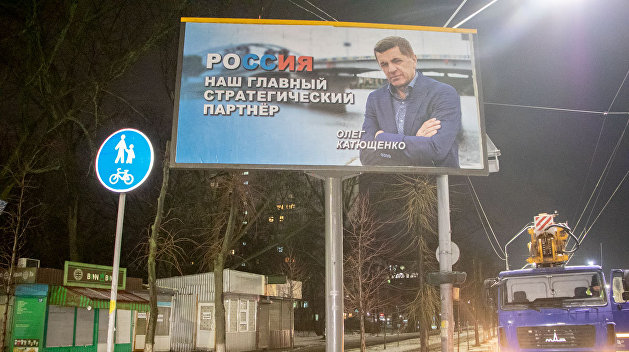 В Киеве расклеили скандальные билборды со слоганом "Россия — наш главный стратегический партнер" с изображением предпринимателя Олега Катющенко. Спустя несколько часов их сняли из-за жалоб горожан.