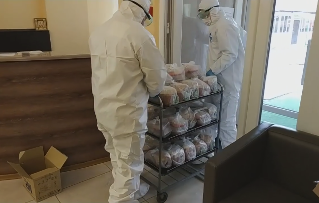 Как видно на кадрах, тележки с продуктами привозит в здание персонал в защитных костюмах, масках и очках.
