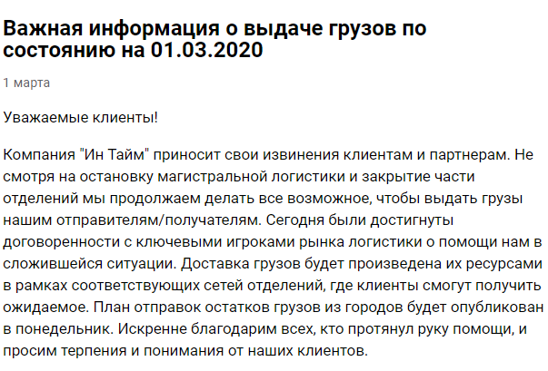 Тем временем на сайте "Ин Тайм" появилось объявление о том, что грузы будут доставлены другими логистическими компаниями.