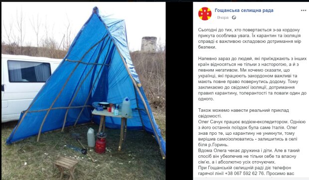 Житель Ровенской области, вернувшийся из Италии, где сейчас бушует коронавирус, поселился на 14 дневную обсервацию в лесу, чтобы не заразить свою семью.
