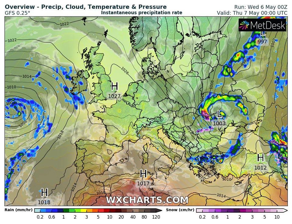 По словам Диденко, 7 мая в Украине погоду будет определять циклон и атмосферные фронты.