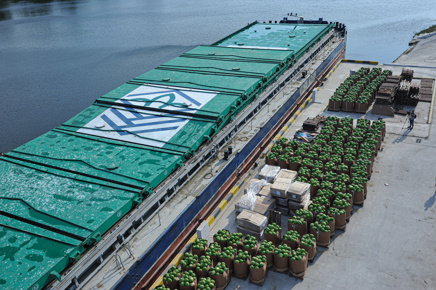 Собранные на поле арбузы осторожно вручную складывают в картонные контейнеры евростандарта, размещенные на поддонах в грузовике. На речном терминале в Голой Пристани краном загружают поддоны на дно несамоходного судна. В закрытом судне водным путем, на котором нет ям и выбоин, осторожно и строго по графику "Нибулон" доставляет невредимый товар в порт назначения. Там так же поддоны с контейнерами разгружают краном и сразу загружают в рефрижераторы. Через несколько часов эти арбузы уже в торговом зале радуют покупателей. Такой путь доставки овощей и фруктов с юга Украины на север значительно уменьшает их потери и помогает в расширении рынков сбыта сезонной продукции. Когда арбузы грузятся насыпью, 10-13% продукции подвергается механическим повреждениям, не выдерживаются стандарты упаковки и транспортировки.