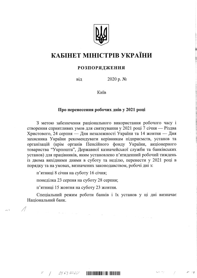 Кабинет министров Украины на заседании 30 сентября принял проект распоряжения "О переносе рабочих дней в 2021 году".