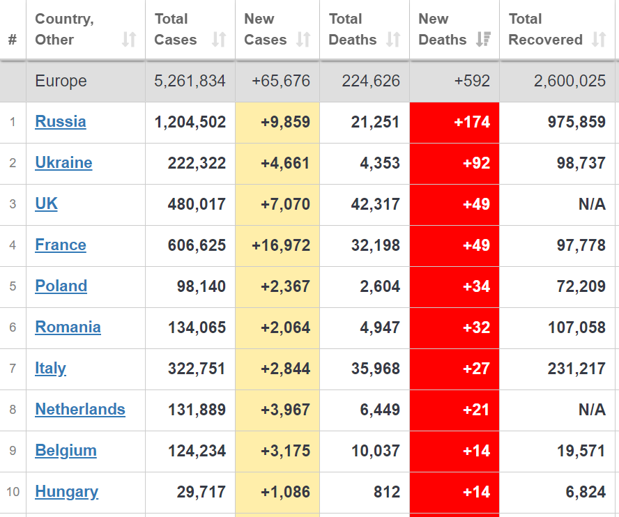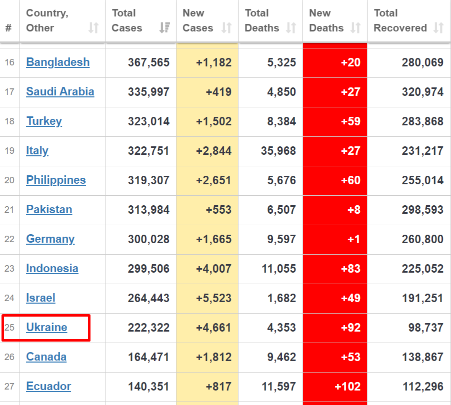 По количеству смертей от COVID-19 Украина на 33-м месте в мире (4353 умерших). По суточной смертности наша страна вчера находилась на 10-м месте (+92 смерти за сутки).