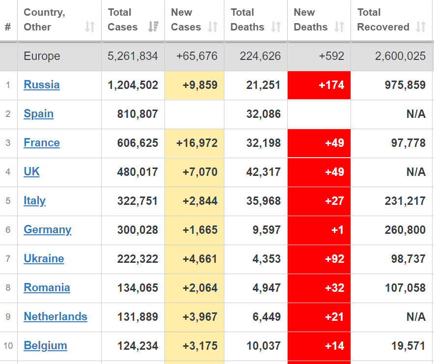 По суточному приросту новых случаев заражения Украина заняла 11-е место (+4661 случай) среди всех стран мира.