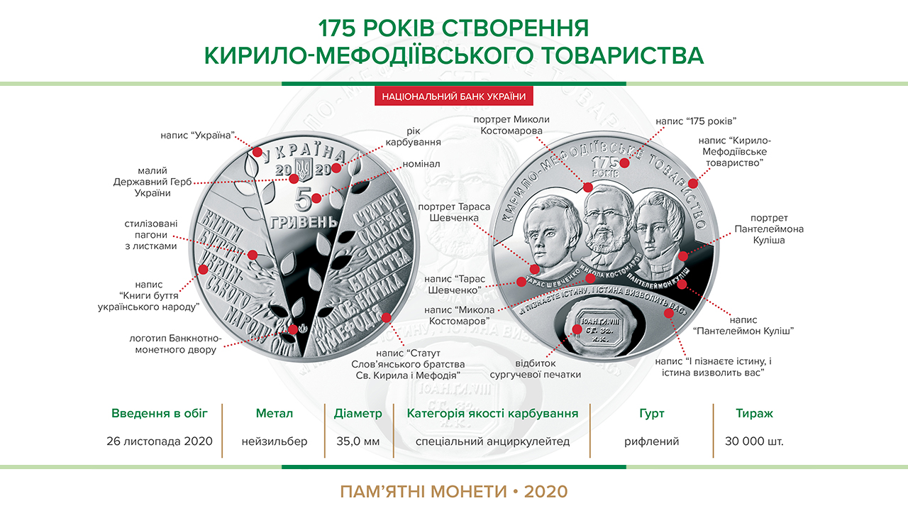 Монета посвящена украинской тайной организации, возникшей в Киеве в конце 1845 года, что было одним из проявлений подъема национального движения и активизации общеславянского движения. Кирилло-Мефодиевскому обществу принадлежит видное место в развитии национально-политической и исторической мысли, становлении украинской идеи. Ведущую роль в обществе играли Н. Костомаров, П. Кулиш, Т. Шевченко, М. Гулак, Г. Андрузский, В. Белозерский.