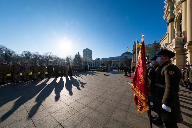 Президент Украины Владимир Зеленский присвоил почетные наименования воинским частям Вооруженных Сил Украины. Во время торжеств у Мариинского дворца в Киеве глава государства вручил ленты с названием почетного наименования и боевые знамена командирам частей.