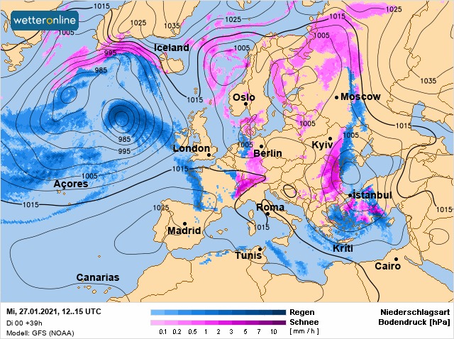 В Киеве 27 января облачно, прохладно, днем около нуля. Циклон скорее всего затронет столицу снегом или поздно вечером завтра, или уже ночью и утром 28 января. Днем в четверг также ожидаются осадки.