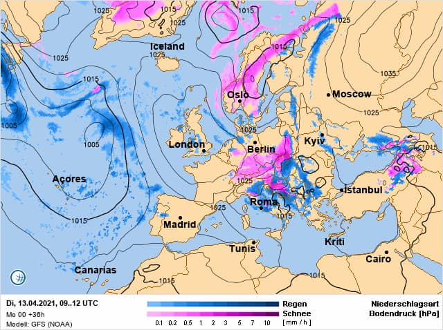 С запада Европы к нашим западным областям начнет подходить мокрый снег, но он более возможен поздно вечером или 14 апреля.