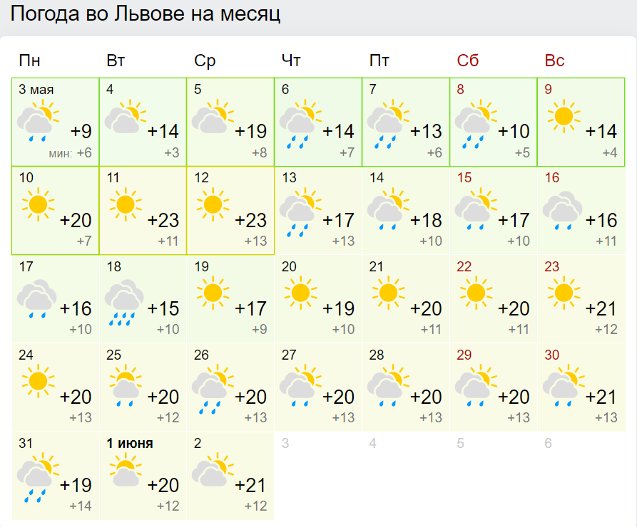 Синоптики уже дают предварительные прогнозы погоды в Украине на месяц. По данным сайта Gismeteo, текущая неделя будет прохладной и дождливой. Периоды дождей и прояснений будут чередоваться до конца мая.