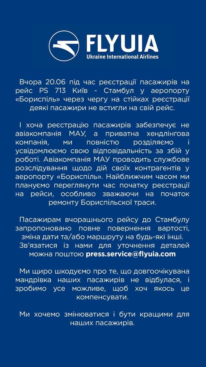 В МАУ отметили, что поводится служебное расследование. Планируется в ближайшее время пересмотреть время начала регистрации на рейсы. Пострадавшим пассажирам предложено полный возврат стоимости (билета), изменение даты и/или маршрута на любые другие.