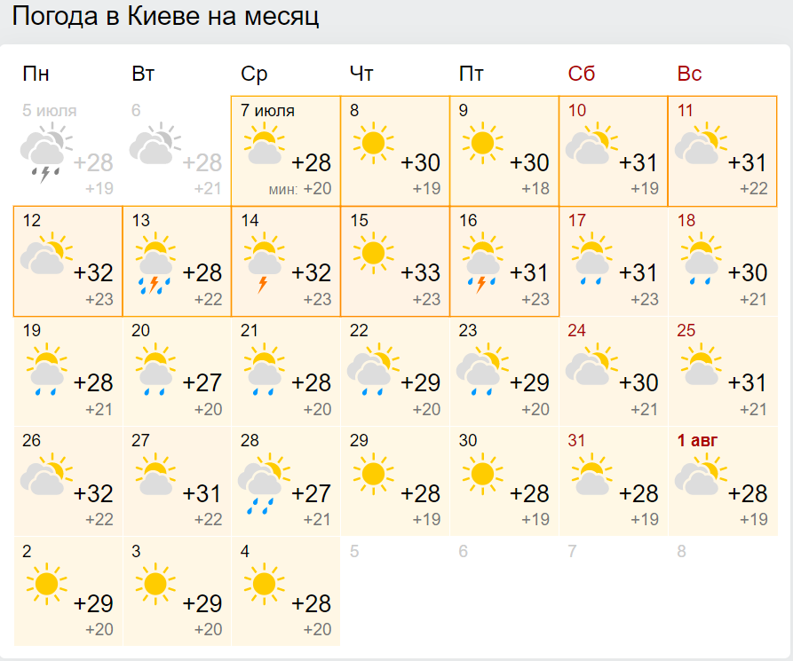 Сайт gismeteo.ua прогнозирует в Киеве на протяжении июля жаркую погоду, от +27 до +32 градусов, с периодическими дождями.