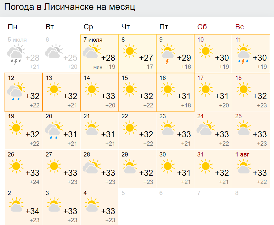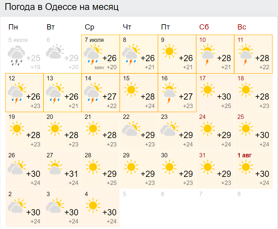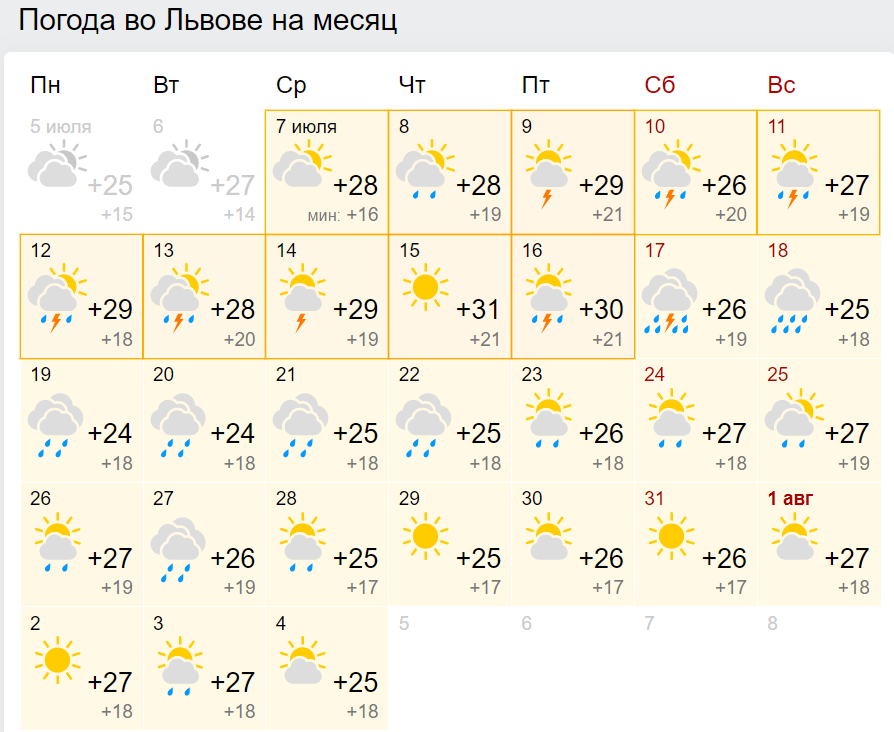 С 11 по 17 июля температура будет повышаться до +28+32 градусов. 16 июля возможен дождь, после чего снова похолодает до +20.