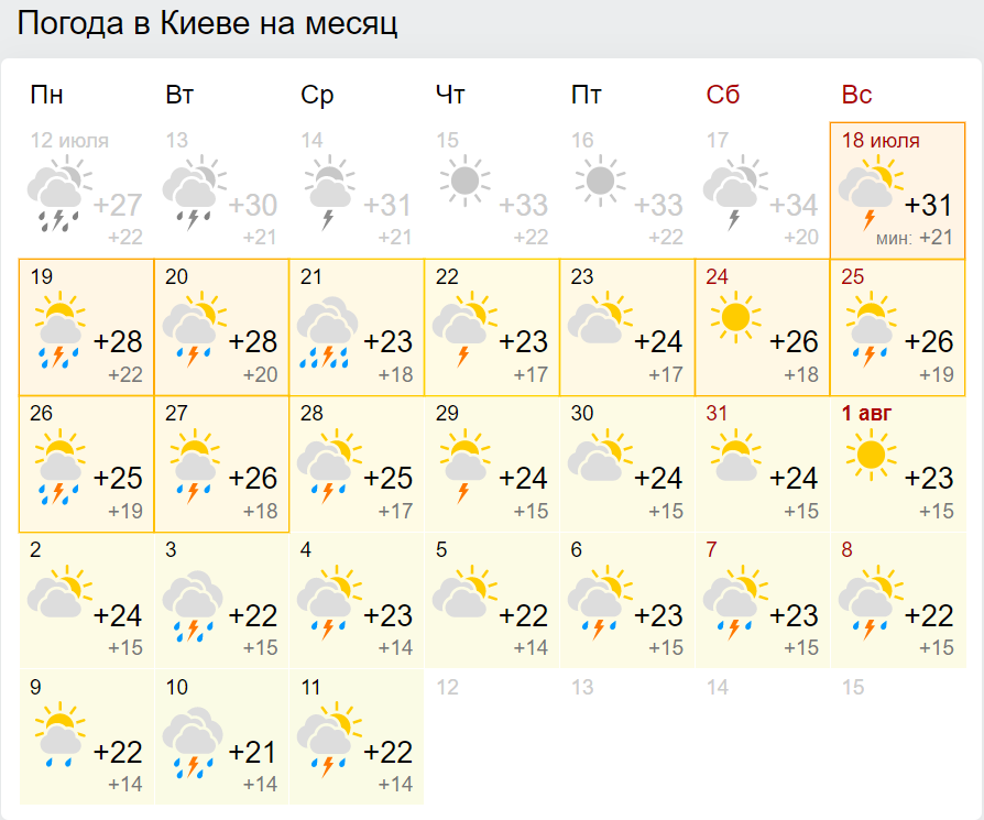 В Киеве 19-го июля ожидается дождь, гроза, возможны сильные ливни с шквалом и градом. Температура воздуха еще будет высокой, однако изменение явно определяется - в течение дня +28 +30 градусов. Во вторник жара спадет до +27 градусов, отметила Диденко.