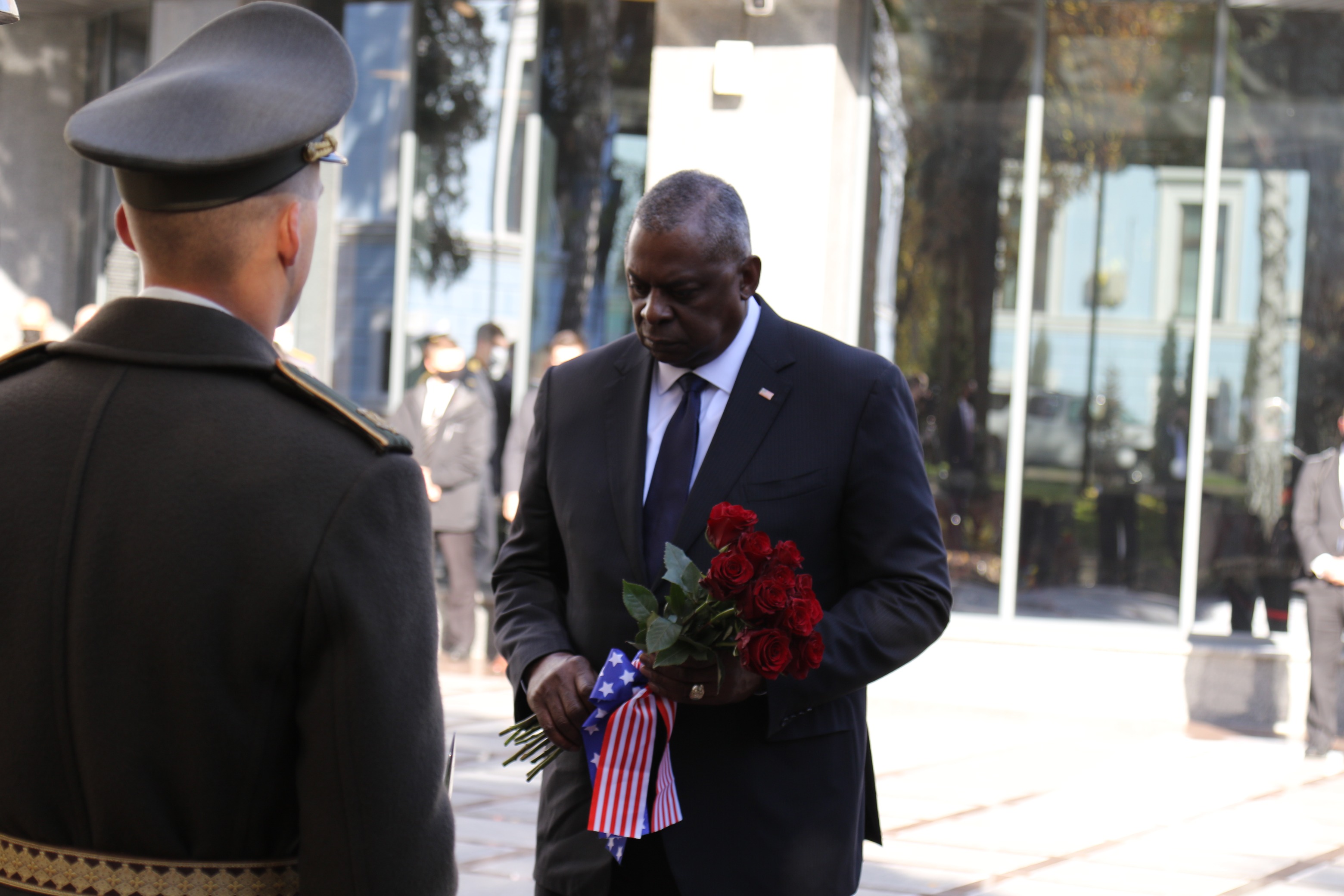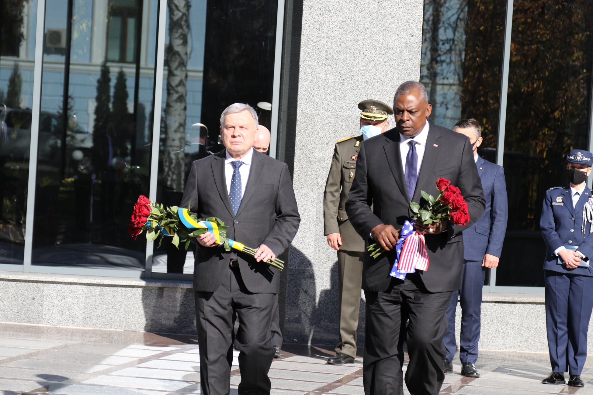 Также Андрей Таран и Ллойд Остин возложили цветы к Стеле с Колоколом Памяти.