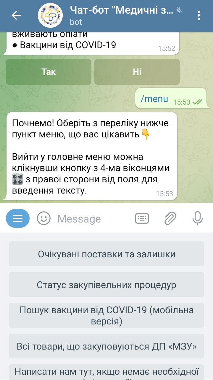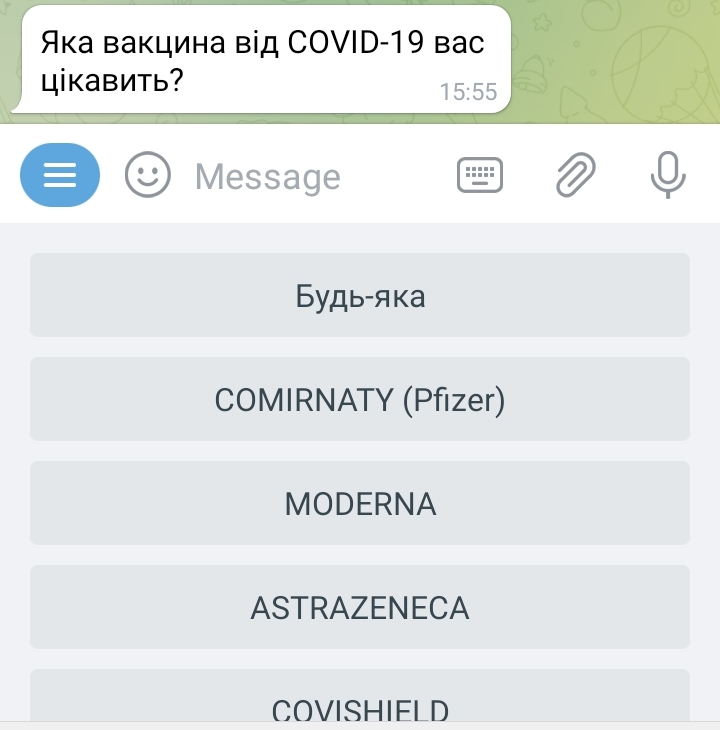 - С телефона - чат-бот "Медицинские закупки Украины" в Телеграмм. Чтобы воспользоваться этой функцией, в главном меню бота выберите пункт «Поиск вакцины от COVID-19». По вашей геолокации система найдет ближайшие пункты вакцинации. Узнать можно и количество имеющихся в этих пунктах вакцин, и их вид.